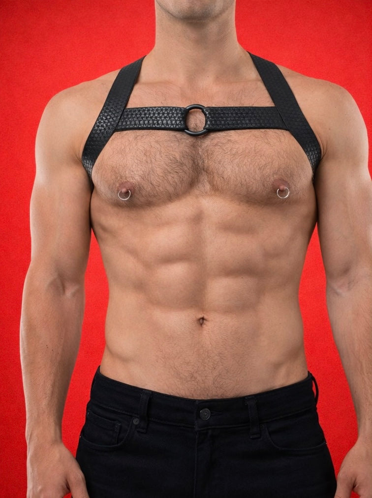 Elastic fetish eco leather gay harness with plastic ring in the middle of the chest.