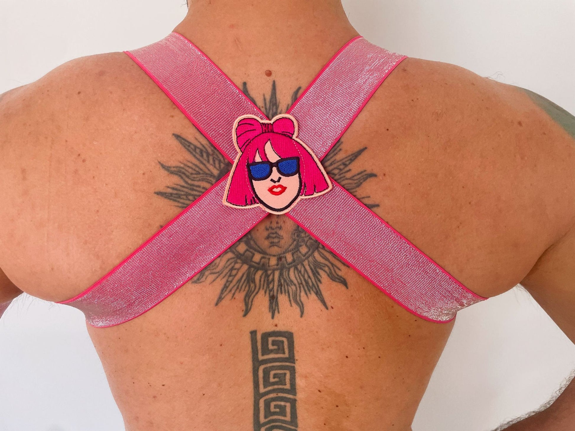 Gay pride party elastic pink harness with patches and plastic decorations